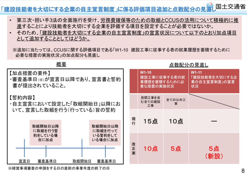 審査項目のうちW点(その他審査項目・社会性等)で宣言企業に対して5点を加点となります。(これに伴い、従来のCCUSを用いた就業履歴の蓄積を評価する審査項目で加点配分が5点分減となります。)
