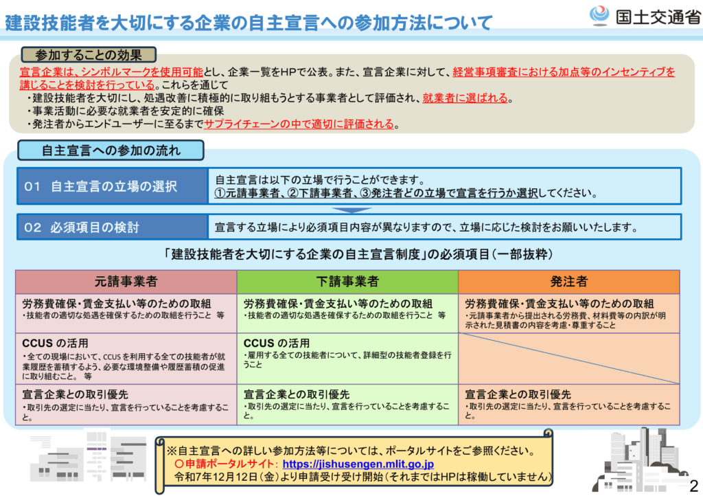 【申請ポータルサイト】:建設技能者を大切にする企業の自主宣言制度|ポータルサイト